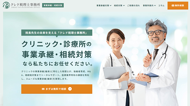 クリニック特化の事業承継・相続対策サイトとして、専門性と信頼性が直感的に伝わるデザインを設計。年間実績や専門家連携を視覚的に配置し、信頼要素を強化しました。無料相談導線を複数配置し、問い合わせを促進。クリニック経営者の悩みに寄り添うコラム構成でSEOにも対応し、長期的な集客基盤となるサイトを実現しています。