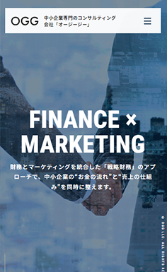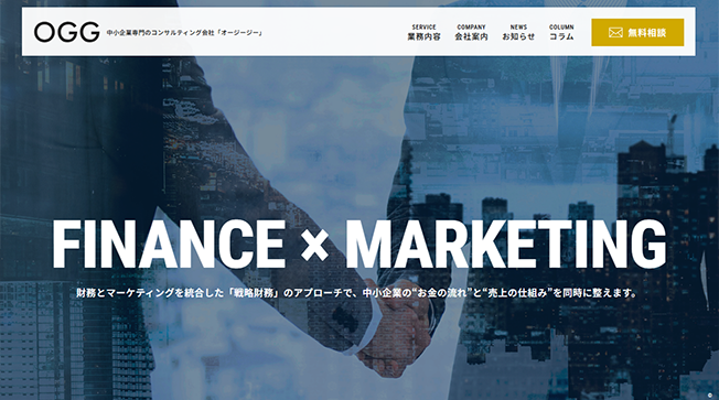 中小企業に特化したコンサルティング会社のホームページ。同社の強みである「財務とマーケティングを統合した戦略財務」を、「Finance × Marketing」という一言で伝えるキャッチコピーとして採用。冒頭のキービジュアルでは、握手と都市風景を重ね合わせることで、“数字を動かし、企業を動かす”というパートナーシップの象徴を表現しています。
