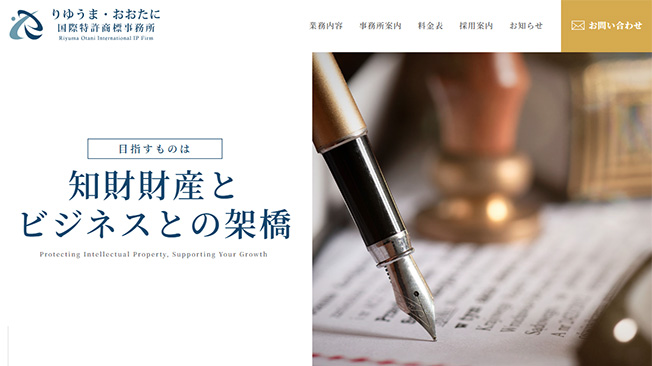 港区にある国際特許商標事務所のコーポレートサイト。知財の専門家として信頼性・専門性・落ち着きを軸に、「知財財産とビジネスとの架橋」というメッセージとともに、洗練された余白・書類やペンの写真で表現したデザインで制作しました。ロゴにおいては8案を制作し、その中からお選びいただきました。