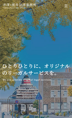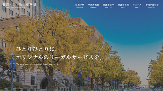 横浜市中区にある法律事務所のコーポレートサイト。ファーストビューには、お客様にご用意いただいた日本大通りの写真を採用し、地域に根ざした法律事務所としての存在感と、横浜らしい開放感・信頼感を視覚的に表現しています。キャッチコピーは、事務所が大切にしている “依頼者一人ひとりに寄り添う姿勢” を軸に、弊社から複数案をご提案。その中から「ひとりひとりに、オリジナルのリーガルサービスを。」が選定され、デザイン全体の方向性もこのメッセージを中心に構築しました。